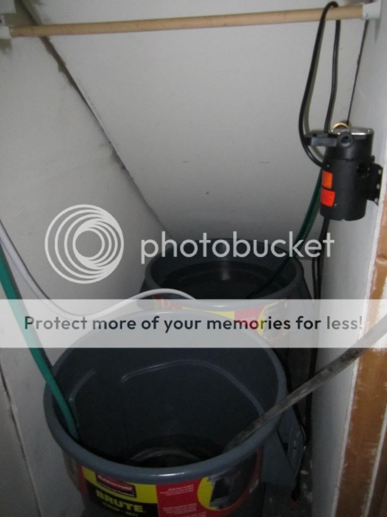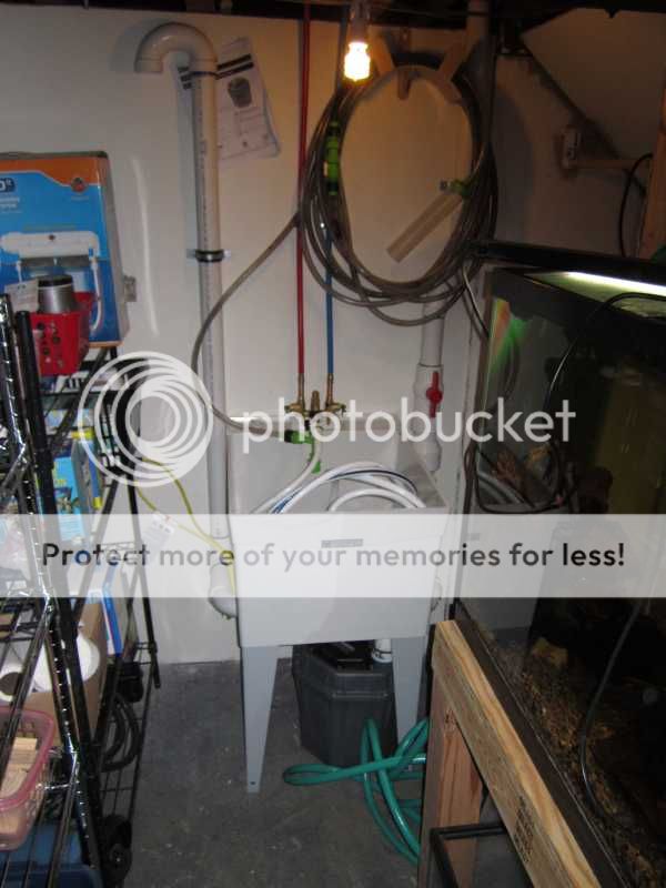 Finally, in March we got the electric and plumbing figured out. We ended up delaying a little bit to save up and do some other electric and plumbing elsewhere in the house at the same time... cheaper that way in the long run. At any rate, the plumbing is somewhat unique. We installed a utility basin next to the water-mixing trashcans. The sink drains into a commercial sump pump. It has a head height of like 45' with a 2" pipe... it's BEEFY. Running full bore with hot and cold water on and water coming in from water changes causes the pump to kick on about three times per minute and it runs for about three seconds every time it kicks on.