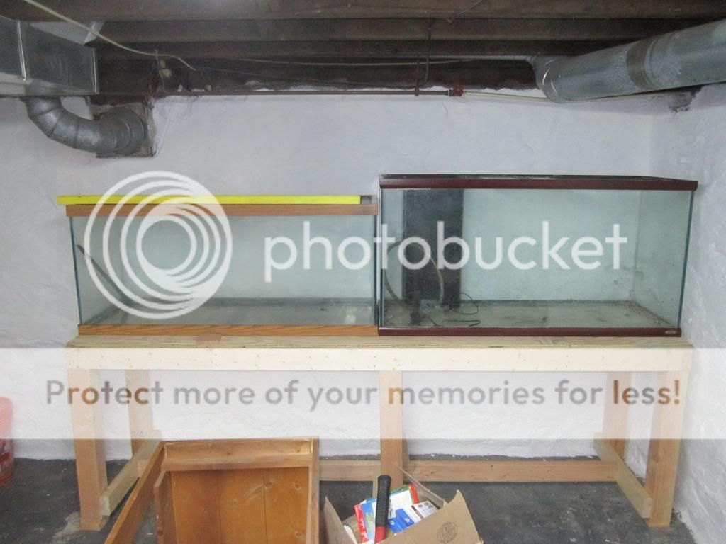 I sealed up the wall around about 1/2 of the fish room with dry-lock and hydraulic cement. This was actually a lot of work, but it did come out really nice. I then built another stand and got two of our larger tanks up and running. We then started budgeting/saving to get some proper electrical and plumbing figured out. Five tanks from 30 gallons up to 90 gallons running off of one outlet at this point... not good