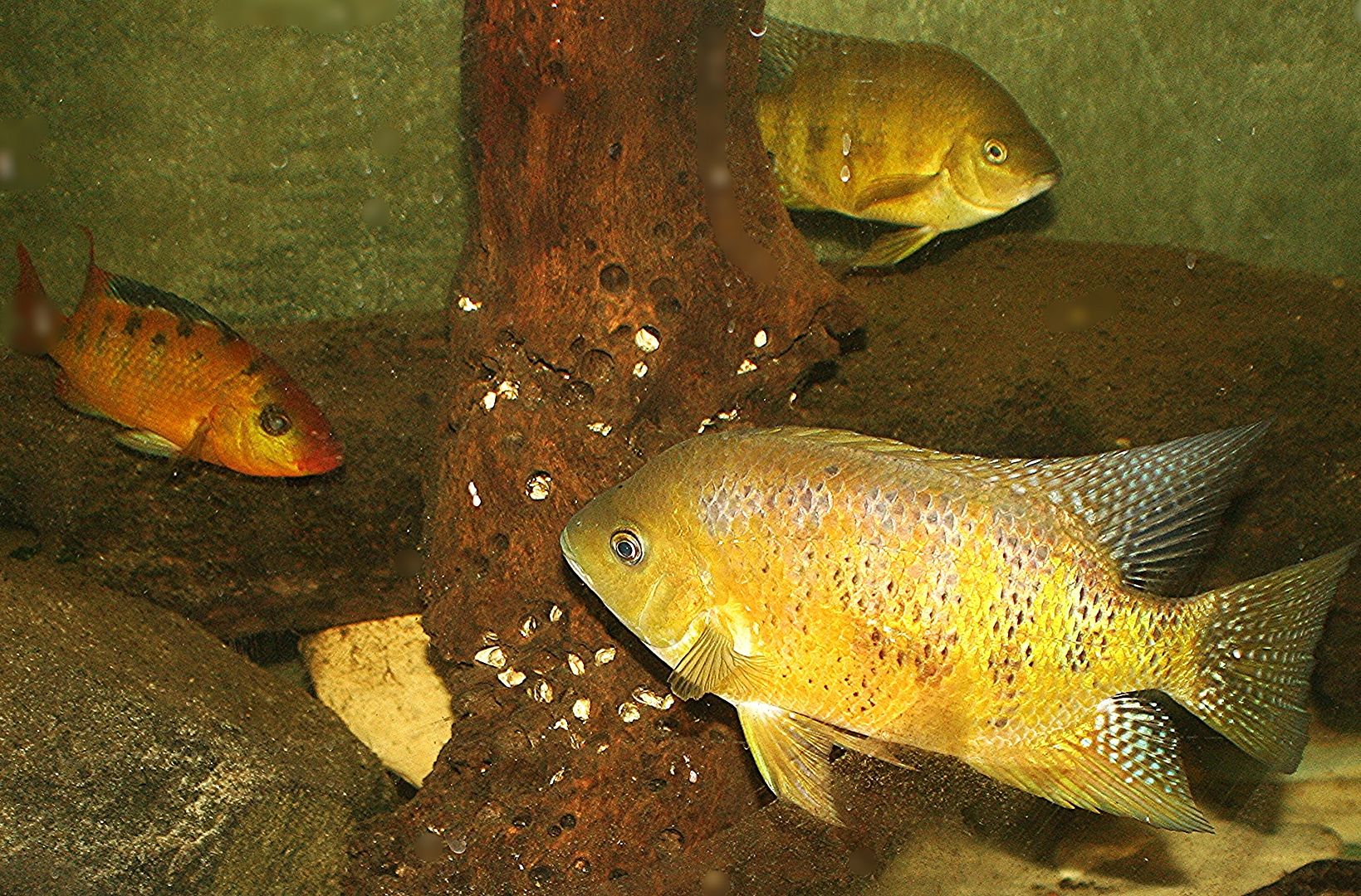 And I find, large vegetarian cichlids find security in a presence of groups of smaller cichlids, just as they would in the company of tetras or other dithers.