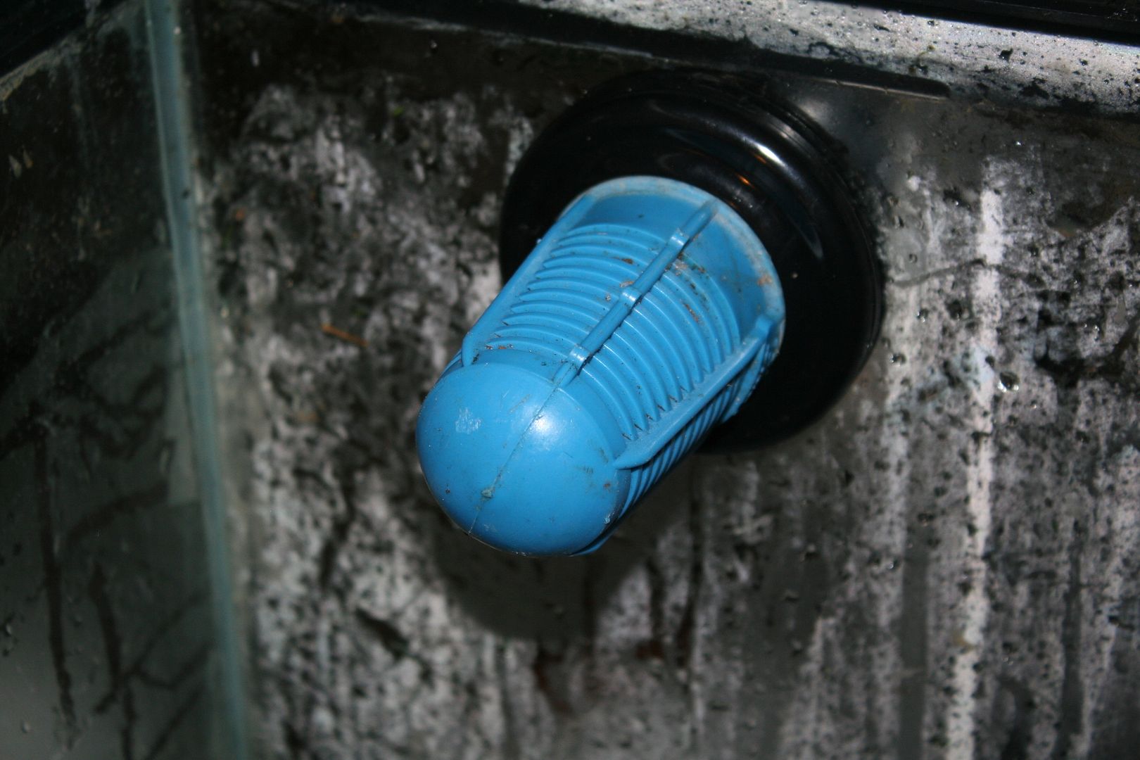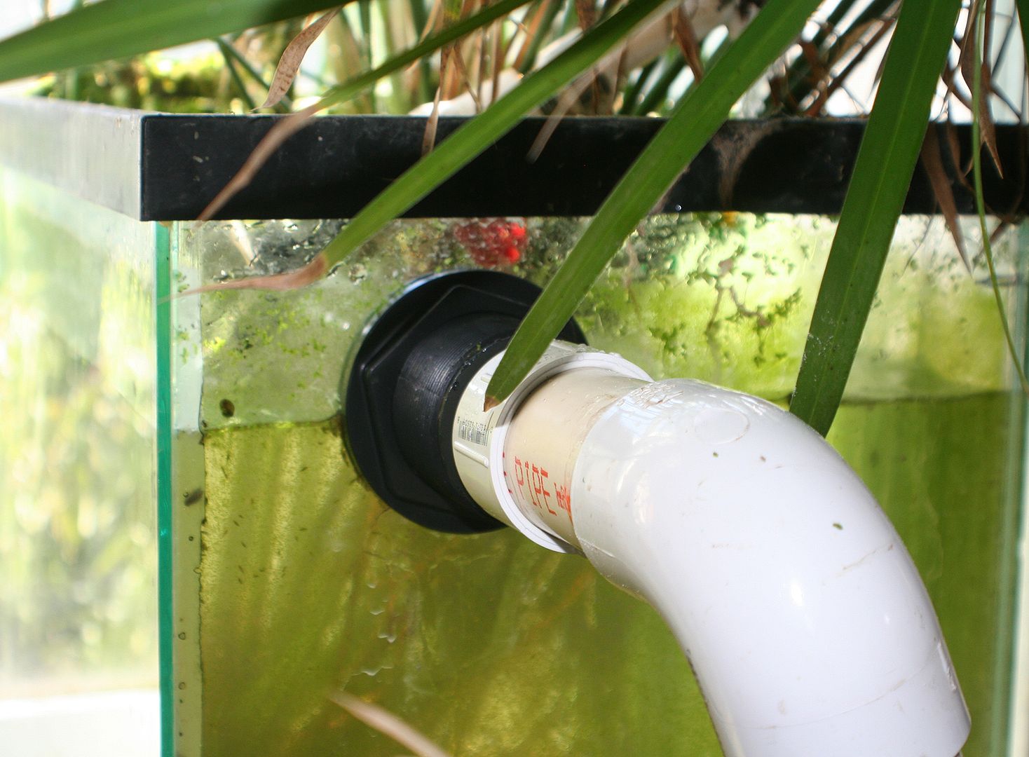 I usually drill holes close to where the water surface will be, on a side, or back of the tank, and either use upturned PVC elbows, or just screw a strainer into the bulkhead.
