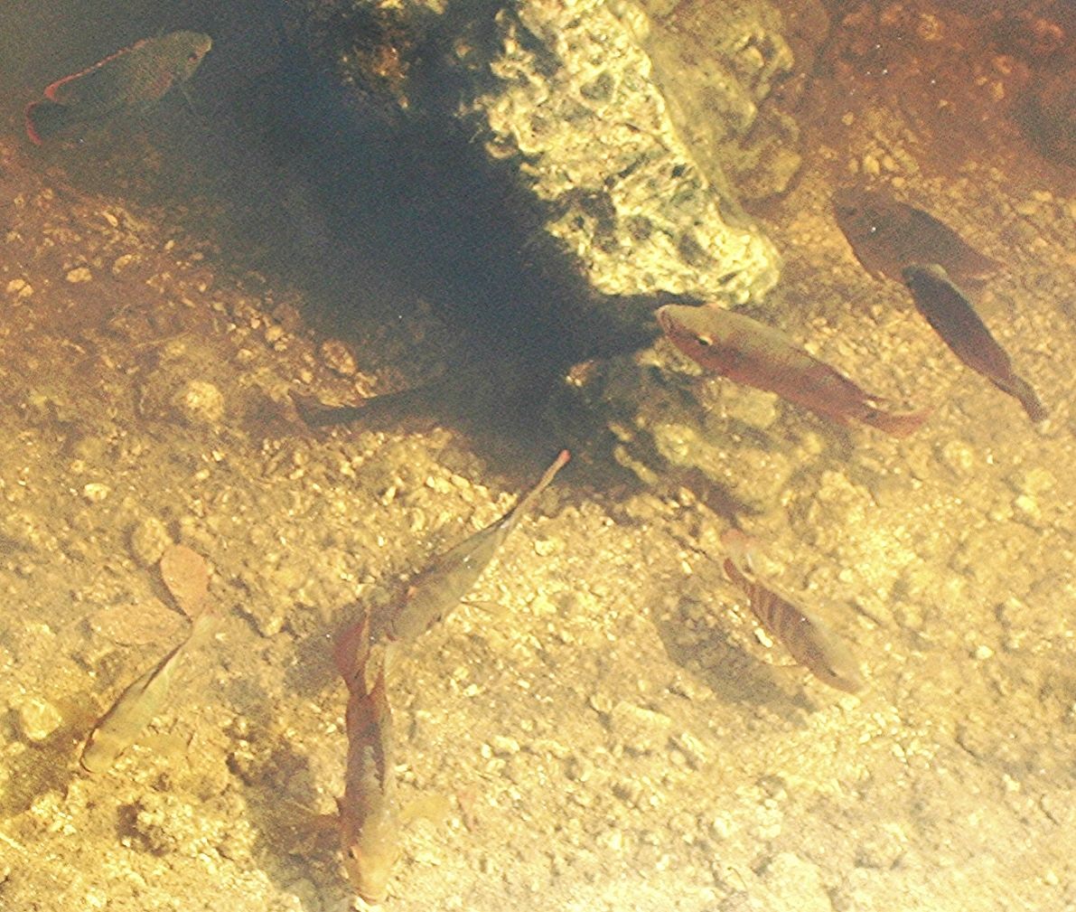 When mature they show dark bands, but when young those bands can be non-existent, there are also Tilapia in the pic, one in the upper left hand corner.