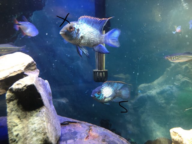 i’ve got two eba and i purchased them from my lfs within two weeks of each other and i want to say one is male and one is female but i just don’t know.. can anyone help me out. i’m gonna post foir different pictures if you look in the top left corner i’ve marked two with an S and that’s the one i believe is male and then i marked the other two with an X and i believe that one is a female then i posted one more picture of them next to each other and also labeled them so you can tell them apart but i want some other opinion.