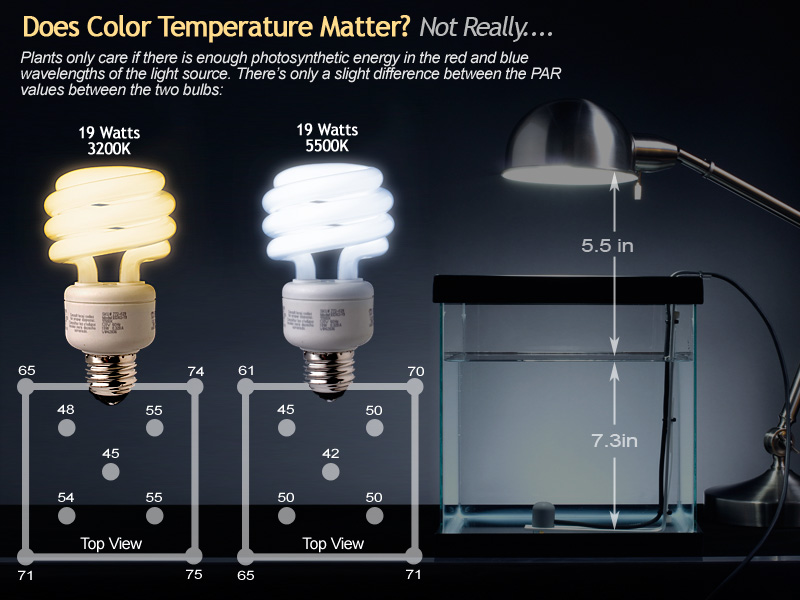 I wanted to follow up to this thread to share some more ideas on lighting with household CF bulbs. AirSong originally had posted asking how much light she should use to light her 2.5gal non-CO2 tank... She was interested in growing HC or other carpeting plants. To her, I answered that she would probably need more than 15 watts. I didn't want to leave it at that however. I set out to investigate and find the right answer. As such, I duplicated her setup: tank size, fixture type, water depth, distance of light from the water, etc... and then took some measurements.