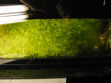 Well I thought it couldn't grow any more in two weeks, but this time it reached the top of the window and was getting ready to spill out the end. My other scrubber was not very grown yet, so I did not want to clean this one today, but I thought I better before it spills. Tests today were N02=0, NO3=2, P=.015? (very faint blue). Feeding is one silverside per week to the eel, 4.8 ml/day continuous feeding of Oysterfeast for the corals (very low amount, currently), and misc nori/daphnia for the fish. Pics: