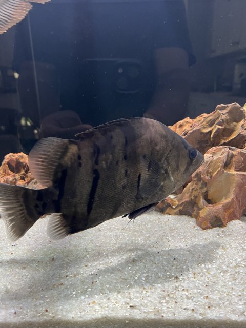 9”-10” semi stable indo tiger. moody ass fish will color up half the time and go dark the other half.