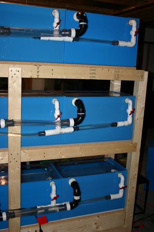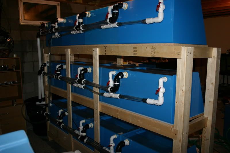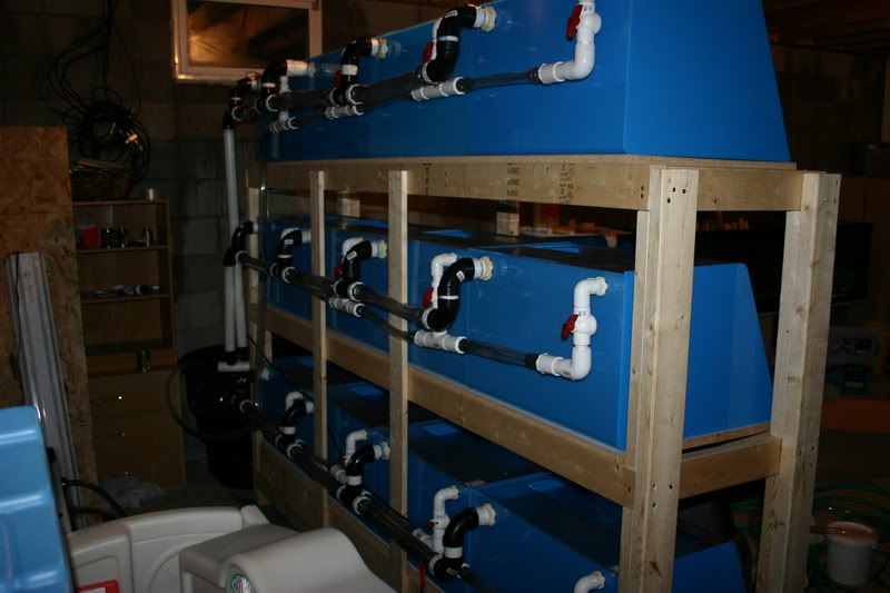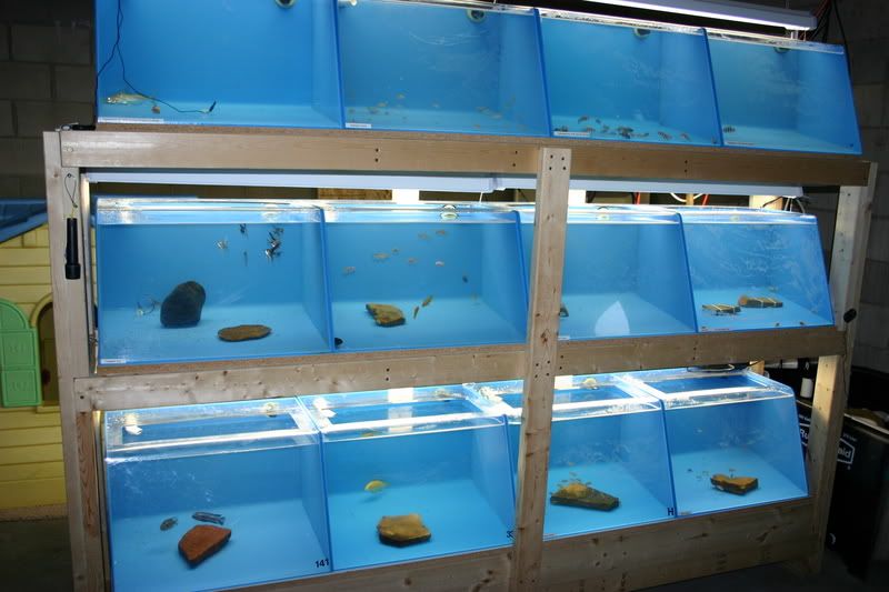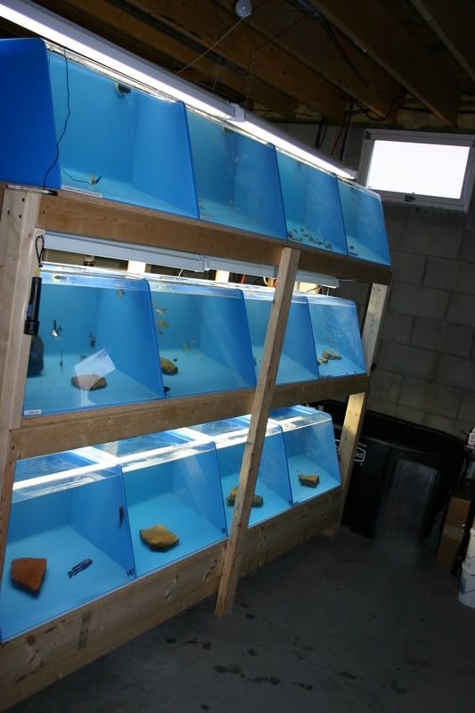Allright folks here it is. A awesome setup for you to start or add to your current fishroom. This includes (12) 27 gallon acrylic aquariums, 6 twin tube strip lights, complete stand to house all tanks, 100 gallon sump, huge return pump, all plumbing, tubing and bulkheads to run all 12 tanks like it is running now, and lids for the tanks themselves. I have been running this setup with great success since about March of this year. Everything works great, the reason for selling it is due to a family move. We are moving and don't want to have to haul this setup with us. I have been raising all sorts of Frontosa and other African Cichlids in it. I have also used a few of them to breed certain cichlids in them.