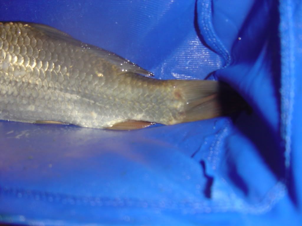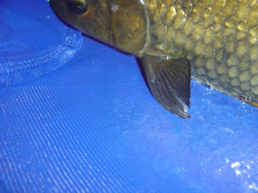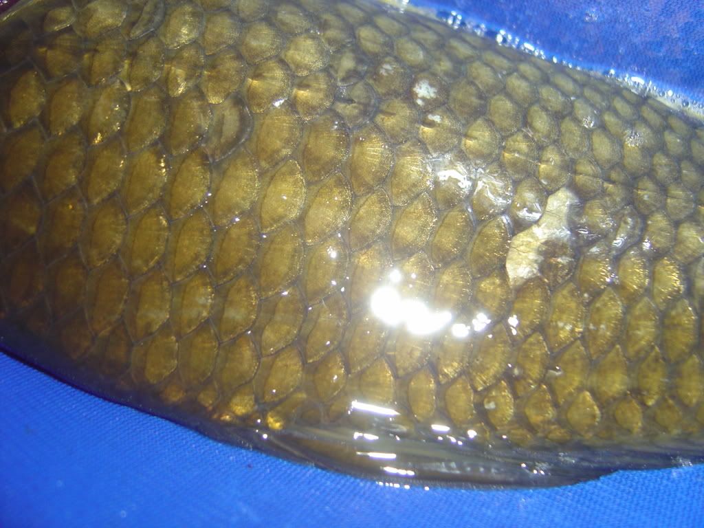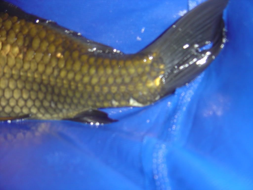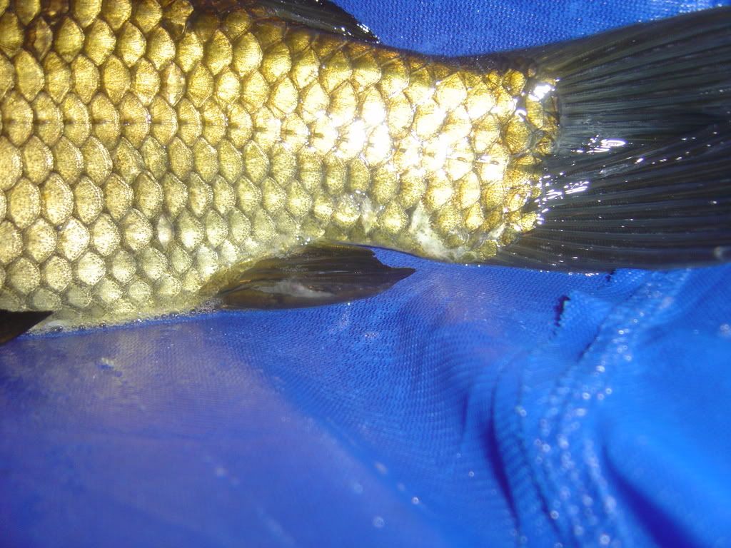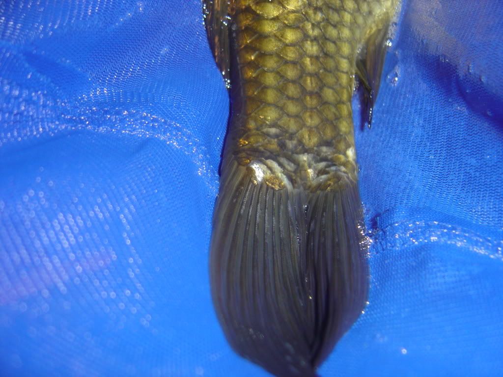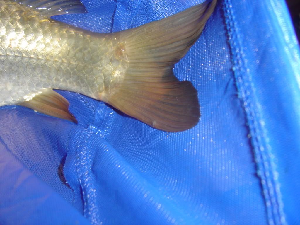 His right fin and side depicting the white stuff, scale loss in the middle, and scaleloss near the bottom back fin.