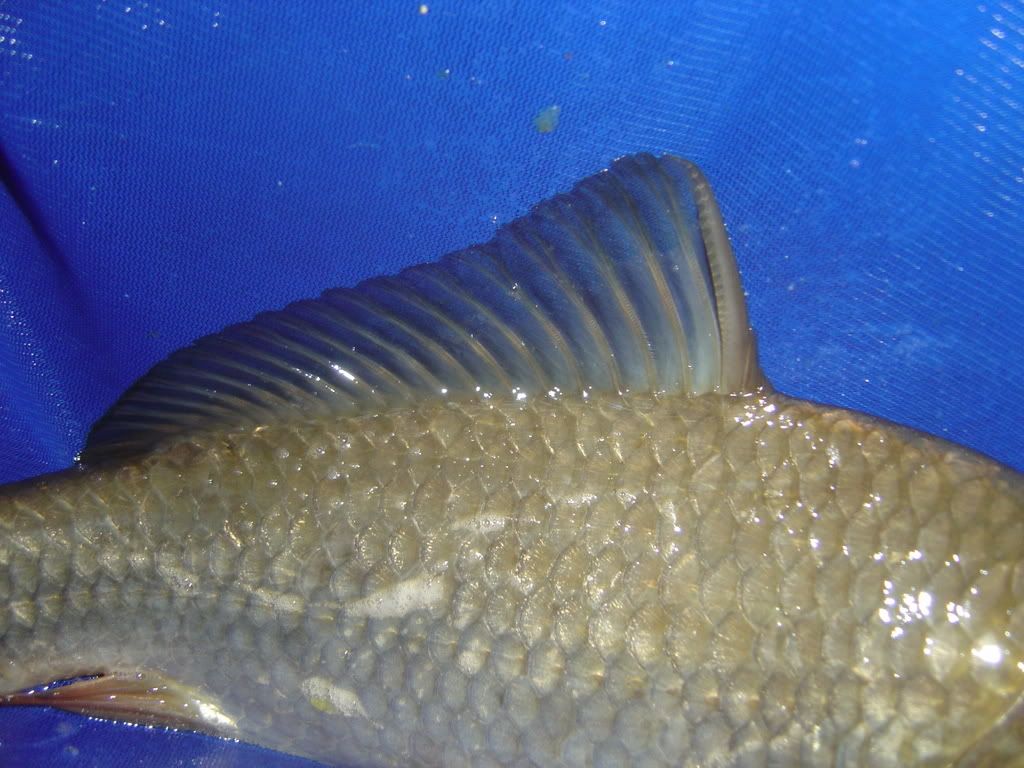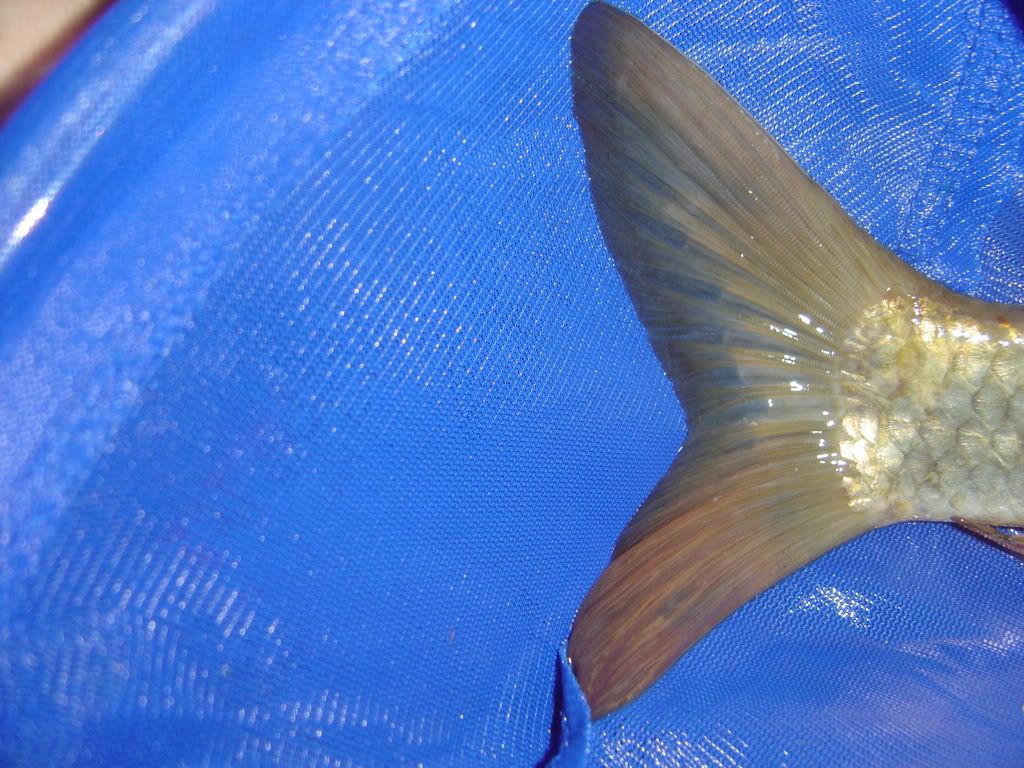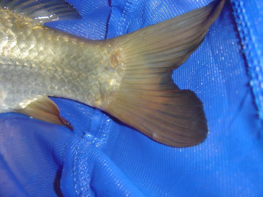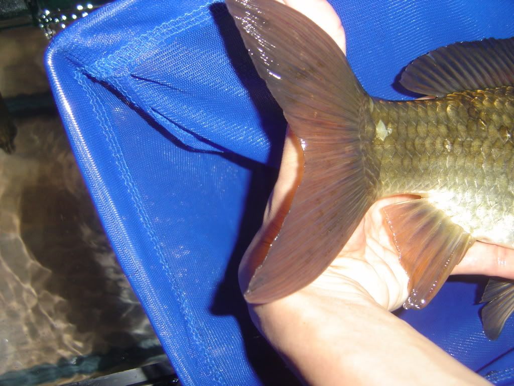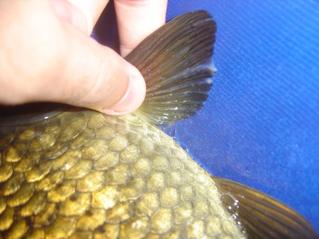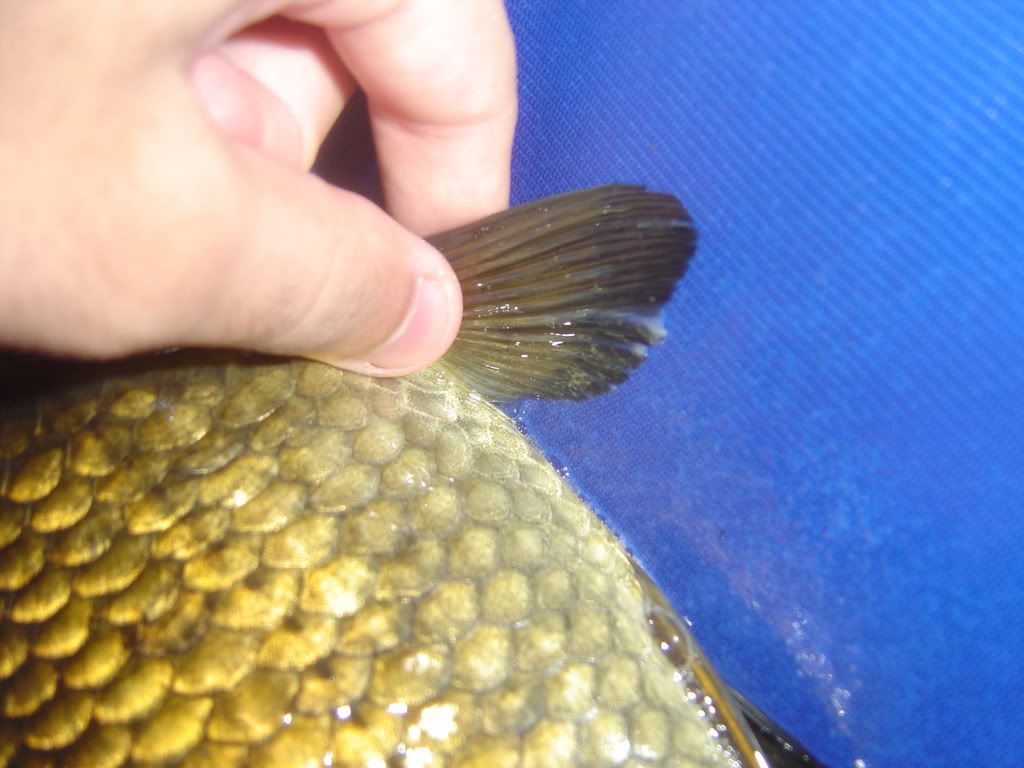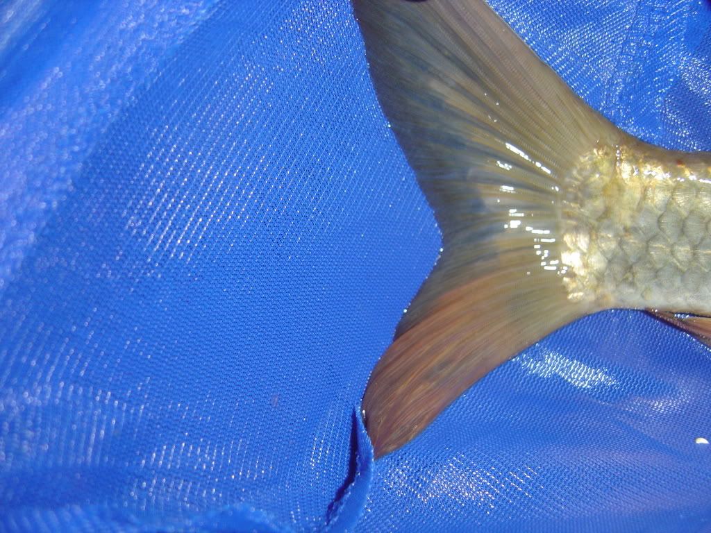 A very good shot of his tail finwith me spreading and holding his fin. Please pay close attention to this one, as I am not sure what to look for here.