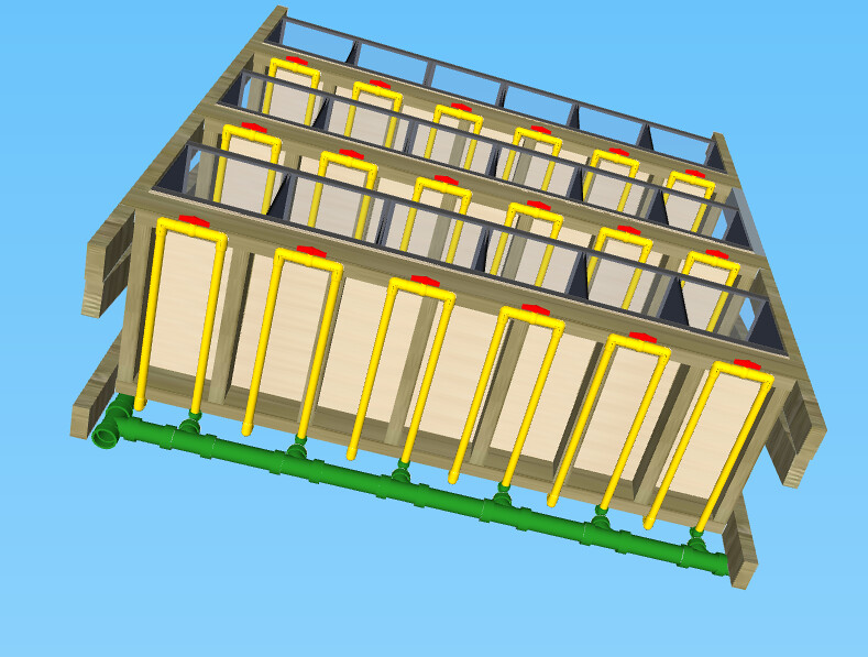 The new water line is where I'm stuck. I made 2 versions; version one being a single line at the top, which will have valves, with airline going to each tank (the same as an air system), with version 2 having a line going to each shelf. I think I like the second version better, but what do you guys think?