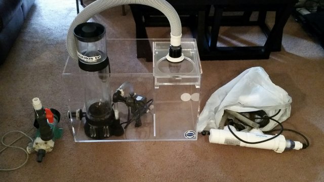 I have a saltwater friendly setup that includes a Euro Fil 24x12x14 with sock holder. It also includes a Kent Marine Nautilus TE Turbo Eductor protein skimmer with pump. You will also get a Aqua Ultra Violent light and a return pump Iwaki 52 l/m which is 825 g/h. Would consider a straight across trade for a more fresh water trickle system with single chamber on the dry side. Or you can purchase for $300.