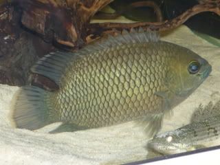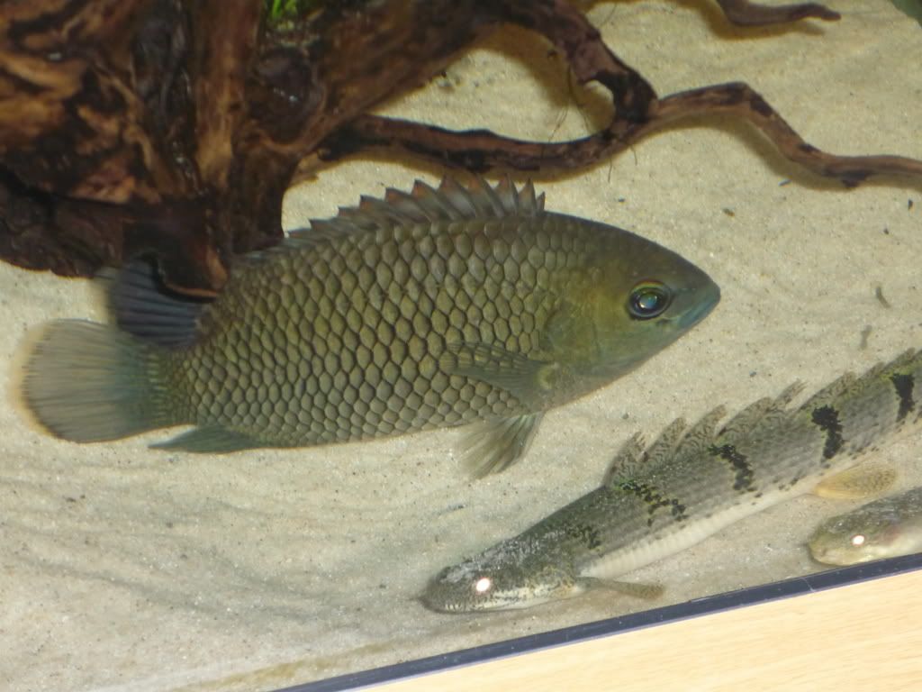 Hes hit just over 6" now-its a very deep, full bodied fish with a massive appetite. As much as I love him my dilemma is he seems to really spook my Tigerfish and keeps my smaller NGT in a corner all the time. Don't know whether to get rid of the Leaffish or the Tigers. I don't see these Leaffish for sale much here in UK. Did have a smaller Banded Leaffish but he had to go due to aggression.
