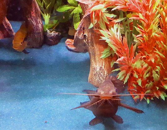 The main tank has the Oscar, chocolate, rainbow, two synodontis catfishes and my heftiest parrot Boss. The other parrots (Tango, Patch, Kong) are singles in their own 38 gallon tanks. Due to aggression and fighting they all had to be separated. Eventually the plan is to get them in 50/55 tall tanks (same footprint).