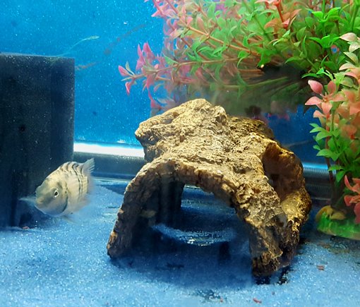 Yesterday everyone got 'dinner'. One meal a day, all you can eat buffet. And brother, they can put it away. Given half an hour the sand is clean of every particle. I see Brick along the back wall with something in his mouth. He swims to the front and spits a suction cup (hook and all) over his pile of rocks. I scooped it up immediately.