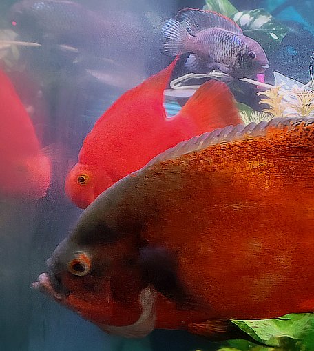 News! Pip's fry are getting enough size that they're drawing a lot of attention. The bold little things are swimming all over the tank and up near the surface. Both the parrot and severum have gone into the log to grab a snack ( they get stuck). Even the acara is trying to 'ambush' them around plants. And today my oscar watched them over the sand (more curious than serious). But they're too fast. The minute any of the larger fish try anything they scatter in ten directions then disappear. Pip is spending a lot of energy watching, defending, and rounding them up. As a result she eats heavily now and I make sure she gets her fill. She even manages to hold Brick at bay but mostly because he isn't all that interested. If she gets too close he tries gobbling her but Pip's smart enough to keep distance from that maw.