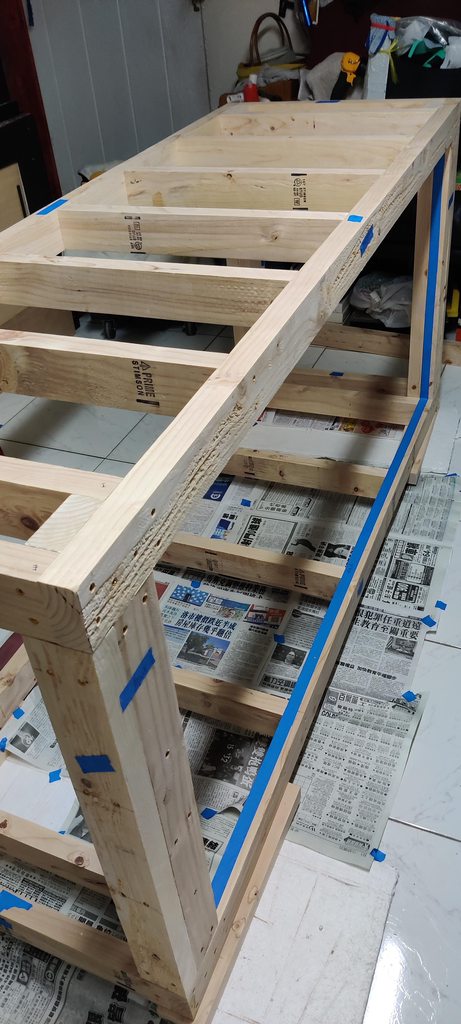 All the 2x4s (actual dimensions 1.5" x 3.5") we're ran through a tablesaw to cut off the rounded edges (bringing it down to 1.5" x 3") just to make things easier to fit.