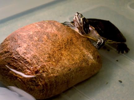 thanks guys, well let me explain a little bit about the housing sit. i kinda wanna keep all my criters in one area, so i have him uner my aquariums, that way they can all be on one timer. and yeah, the rock is in the middle so that he wont escape, although, it also does kinda break the current up, and creatae different zones in the tank. im not to shure about the floating styro. since it will release chem's into the water, and i cant really keep it uner the heat light. i also added a bubler on the opposite side of the tank, as well as proper lights (photos below). i keep her in the pen because it is a lot larger (surface area) than any aquarium with out being 2 feet tall, and personally, i think its pointless, since they only need 6 inch of water.