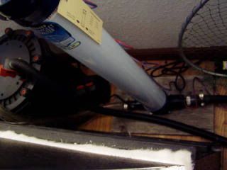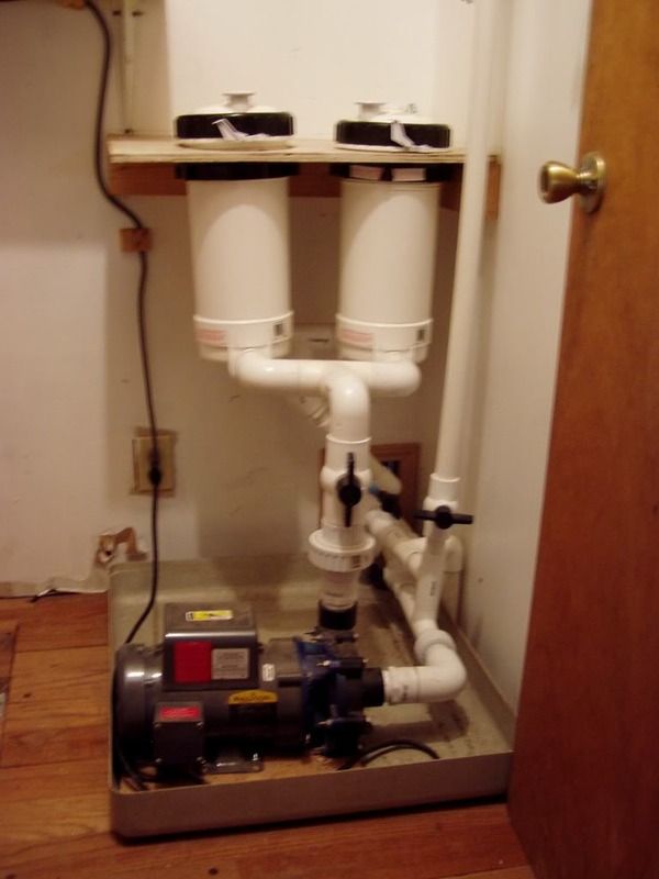 The plumbing for our water changes is plumbed into our mechanical filtration system. Here's an overview of our filtration. Our 300 gallon tank which houses two large pacu has a 400 gallon capacity ProClear wet/dry filter running with a CA-6000 pump 1560 gph. This sits on the floor behind the tank and is plumbed in to one of the overflow boxes. We have the spraybar return from the wet/dry filter hanging in a plugged off overflow box which also has the heater for the tank. For mechanical filtration, we have two Rainbow spa filters run by a Hammerhead pump (5800 gph). The mechanical filtration system is housed in a converted old furnace room which is directly behind the tank.